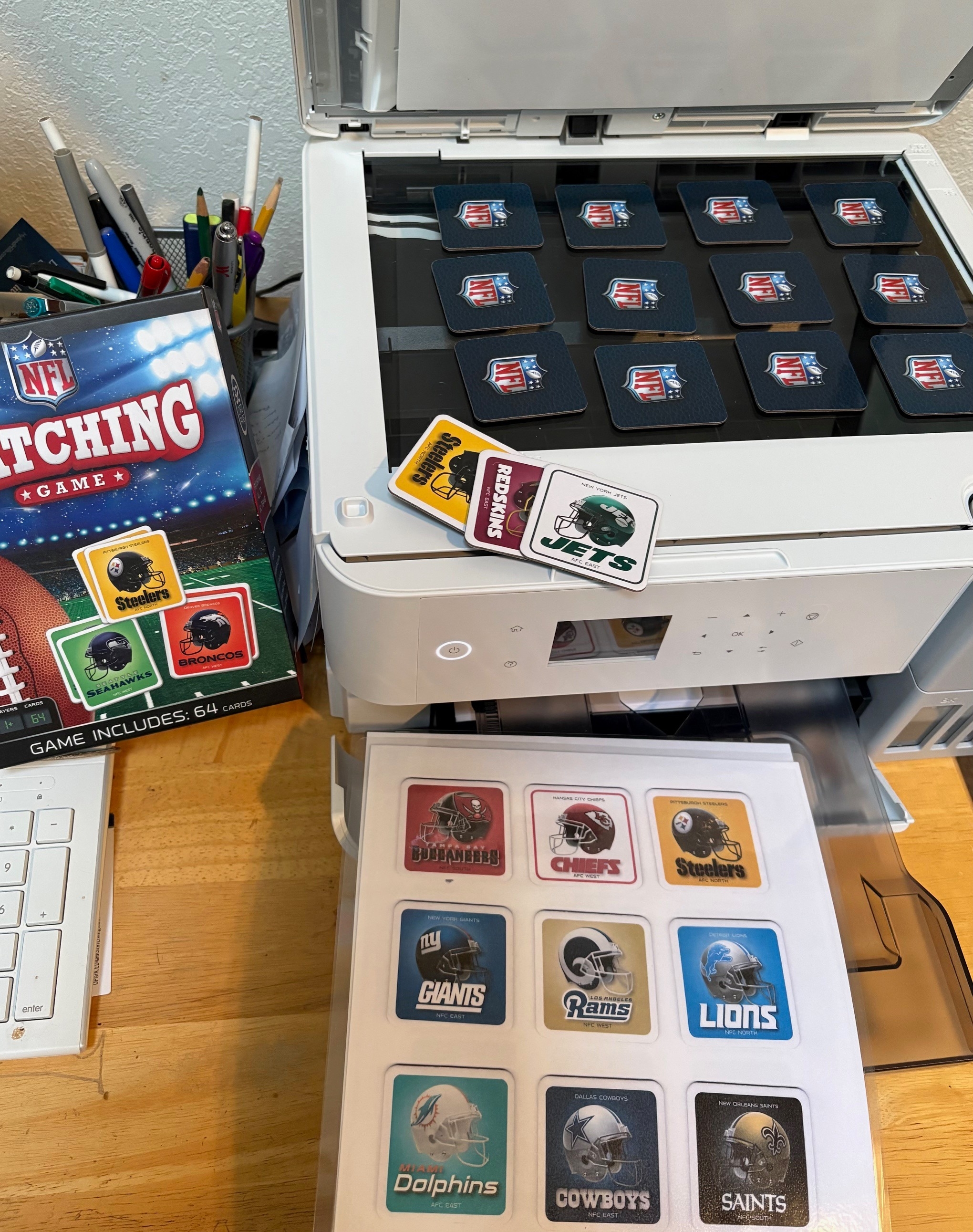 Memory cards are a great matching game because they are two of the same cards. Take a set of memory cards, place the memory cards of the printer or scanner and print a copy (see figure). Next, take the set of memory card to match the copy of memory cards.
