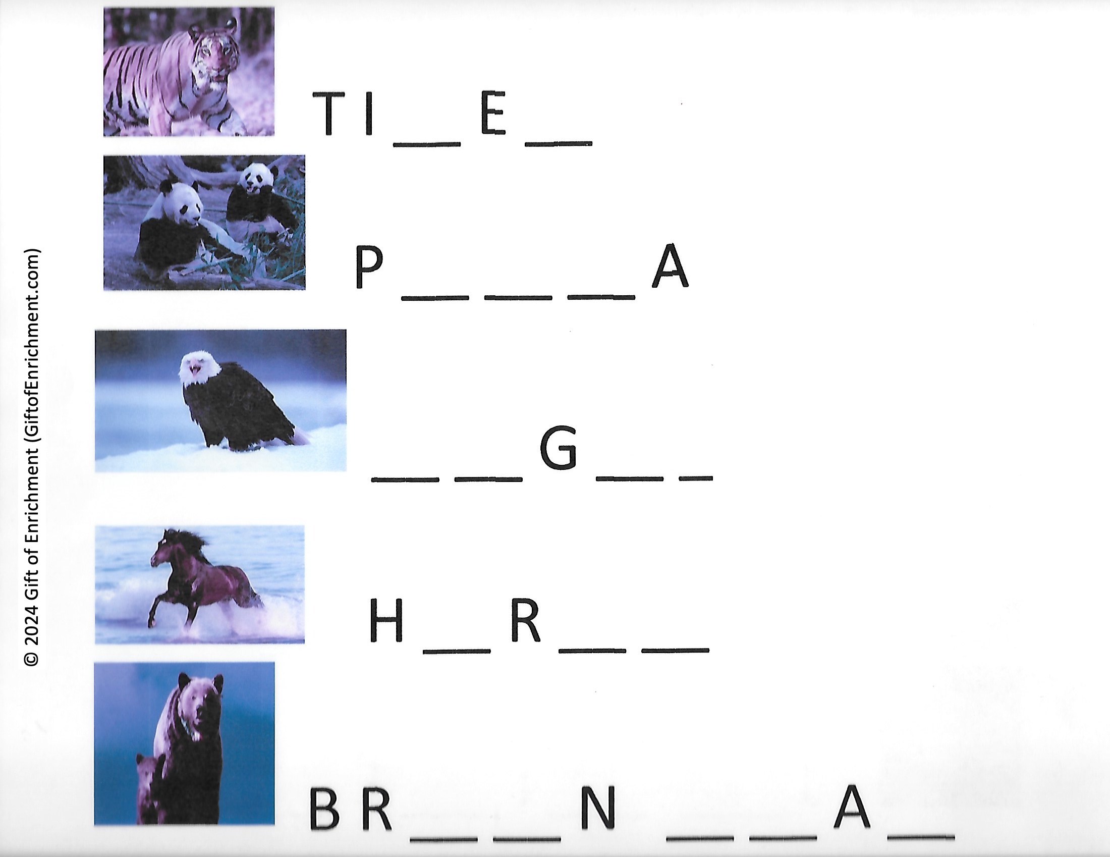 Missing Letters is a fun and educational game that helps cognitive skills. Each page has a list of words with one or more letters missing from each word and an image associated with the word. The dementia participant, along with a set of letters, can use them to fill in the blanks. For early-stage dementia (D1), more missing letters are provided for each word.