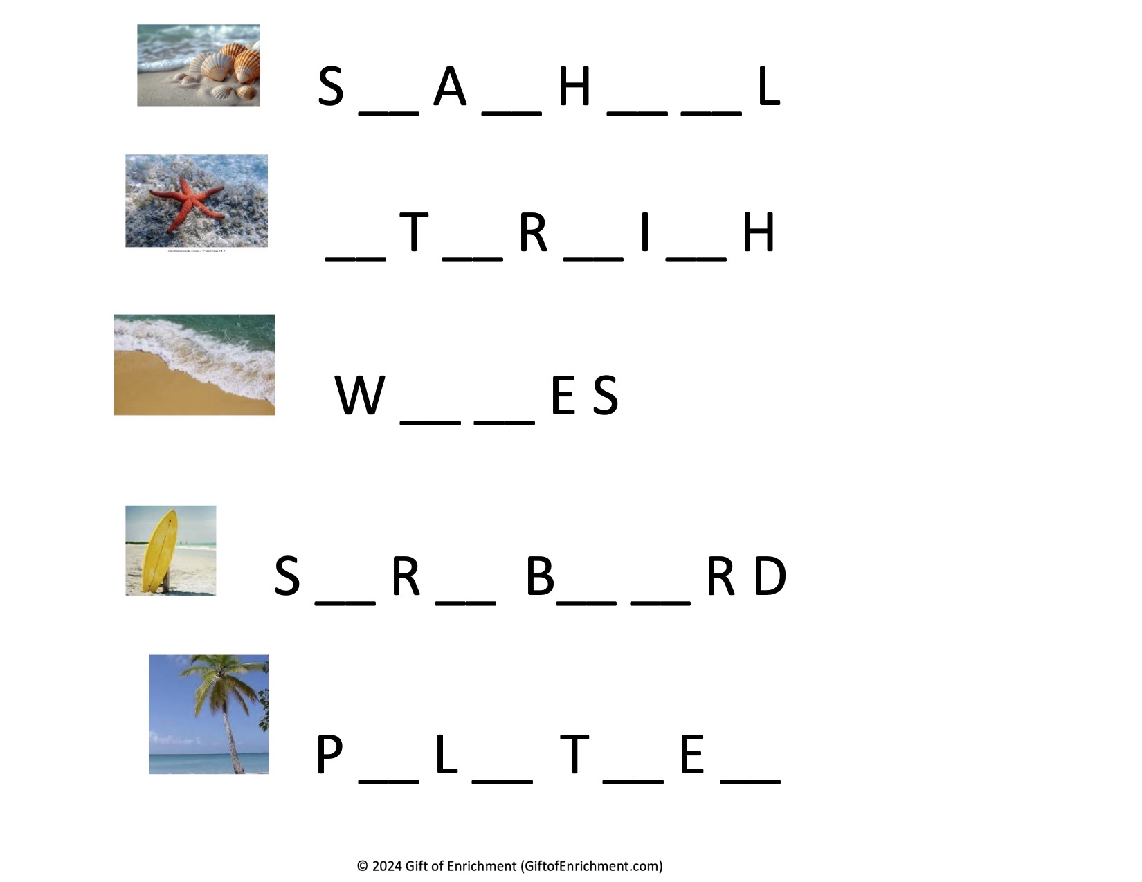 Missing Letters is a fun and educational game that helps cognitive skills. Each page has a list of words with one or more letters missing from each word and an image associated with the word. The dementia participant, along with a set of letters, can use them to fill in the blanks.