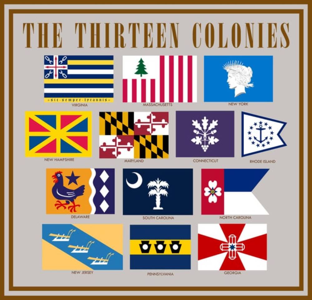 Here are the names of the first 13 states or colonies and the map. https://en.wikipedia.org/wiki/Thirteen_Colonies