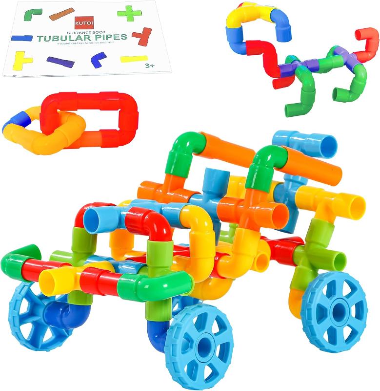 Group pipes by color or size into divided bins. Use a laminated card showing a short pipe sequence to copy.