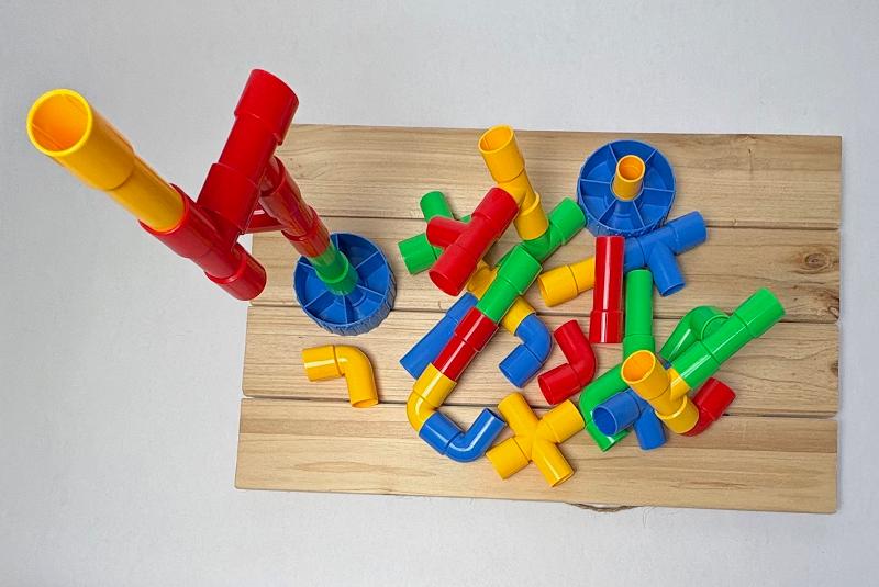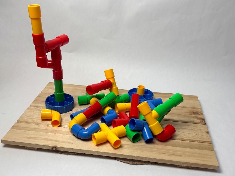 Lay out pipes in a tidy, uncluttered arrangement on a table. Present one example—either a completed pipe structure or a matching pattern—based on resident’s cognitive level. Ensure materials are safe, easy to grip, and free of overwhelming stimuli