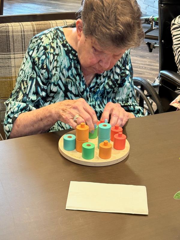 This high-quality pegboard offers tactile engagement and fine motor stimulation. It’s particularly meaningful for memory care residents, many of whom found joy in stacking dishes and coffee cups. This activity gently echoes those familiar motions, encouraging comfort through muscle memory and sensory satisfaction.