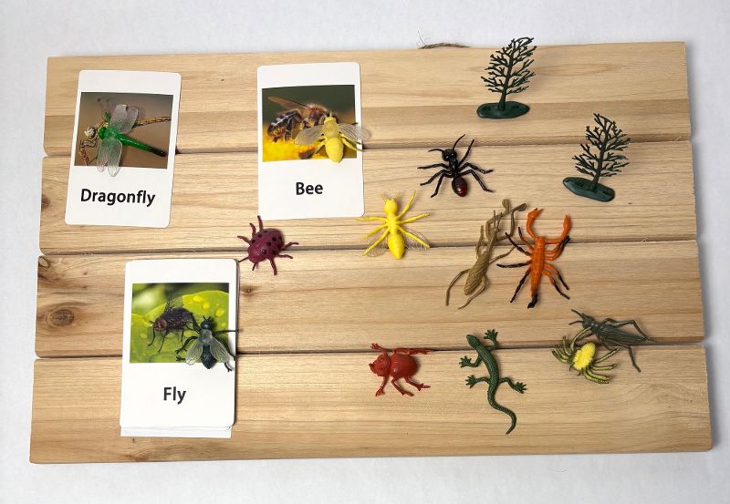 • This Montessori‑inspired matching exercise uses realistic insect and animal figures paired with picture cards.