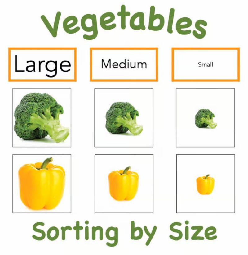 • A selection of vegetables in three sizes (e.g., baby carrots, medium cucumbers, large zucchinis)
