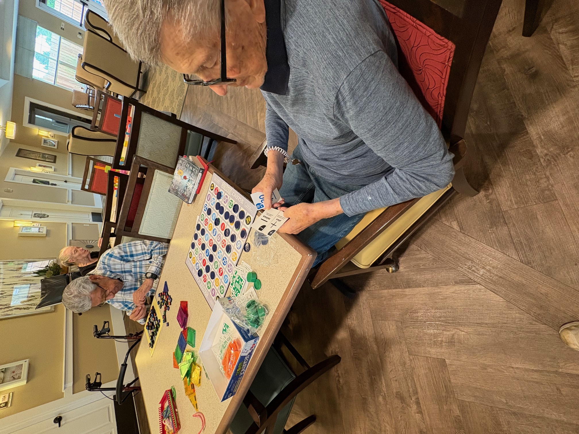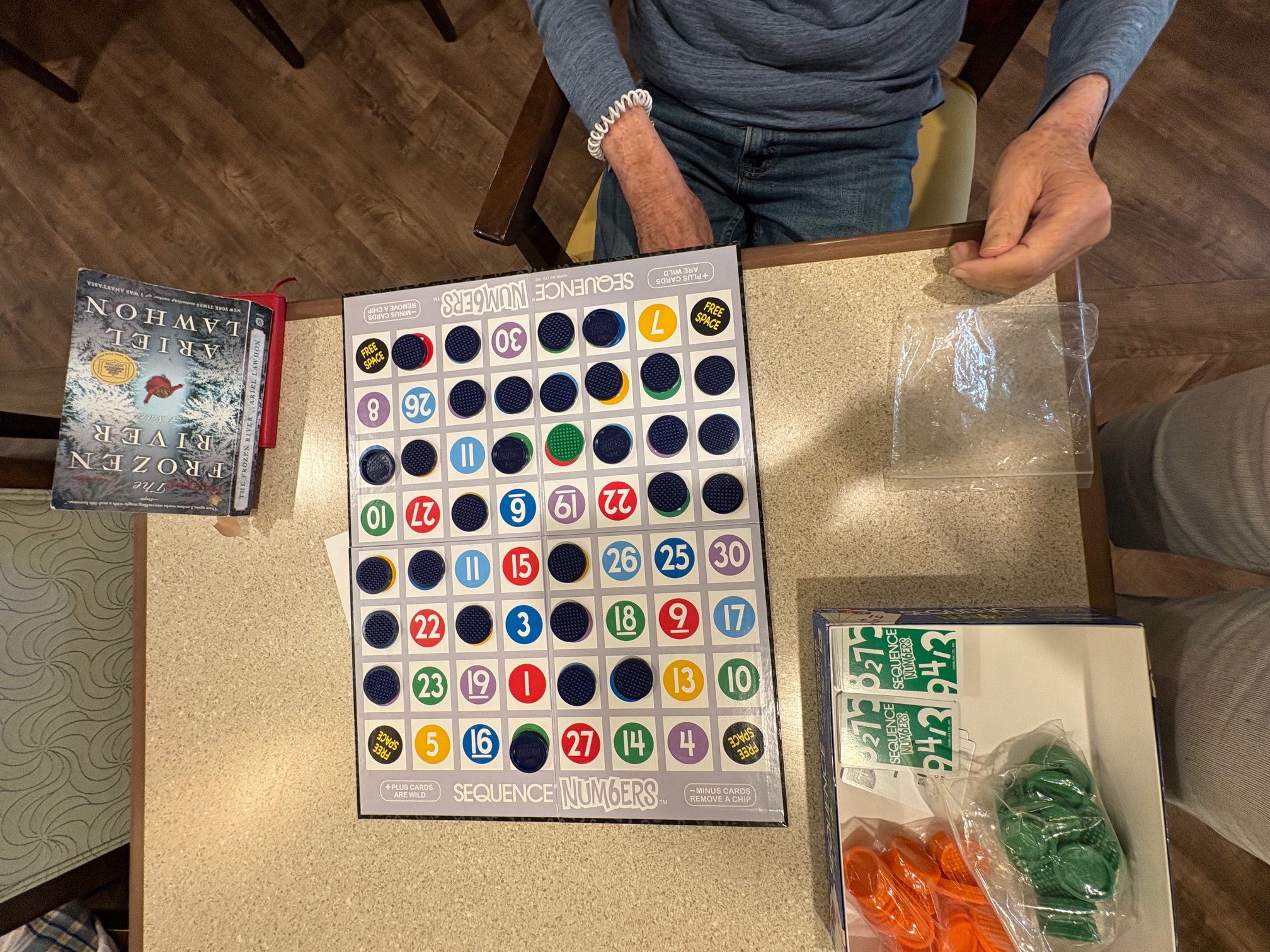 You will need a Sequence Numbers game set, which includes the game board, playing cards, and chips. Get ready to challenge your resident's math skills (adding and subtracting) and have them place a chip on the game board that match the number of the playing card. That it! Your dementia resident is be engaged.