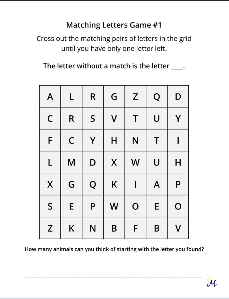 In this matching game, you must find and cross out any matching letters in the grid. You will be left with one letter without a match. When you have found it, do the little exercise at the bottom of the worksheet.