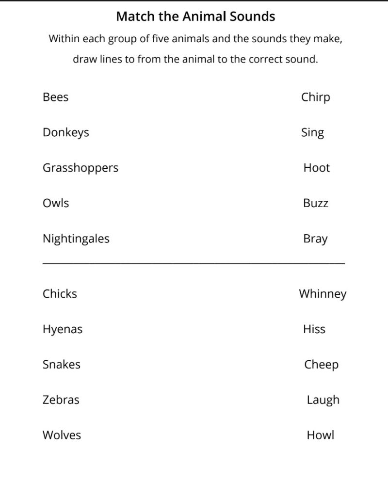 On the printable worksheet, you will find the names of different animals on the left. On the right, there are different names for the sounds they make. Draw lines from the animals to the relevant sound.
