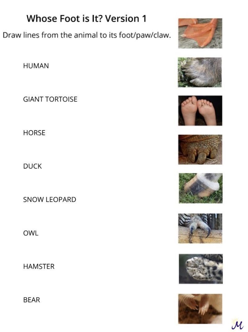 In this activity, you will see eight pictures of different animal feet. The names of the animals are given. Your task is to draw a line from the animal to the picture of its foot.