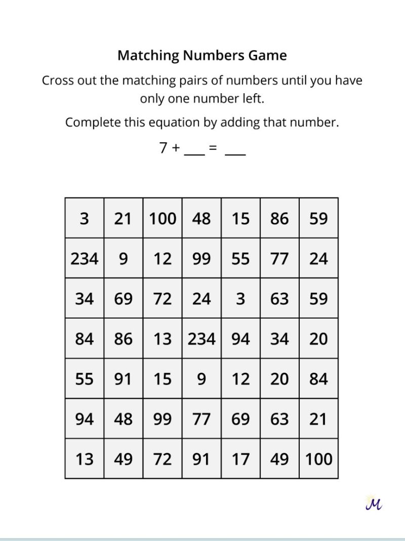 In this number puzzle, there are pairs of matching numbers in the grid. Search and cross off each pair as you find it. When all the pairs are matched, you’ll be left with just one number. Use it to complete the equation, and write down your final answer.