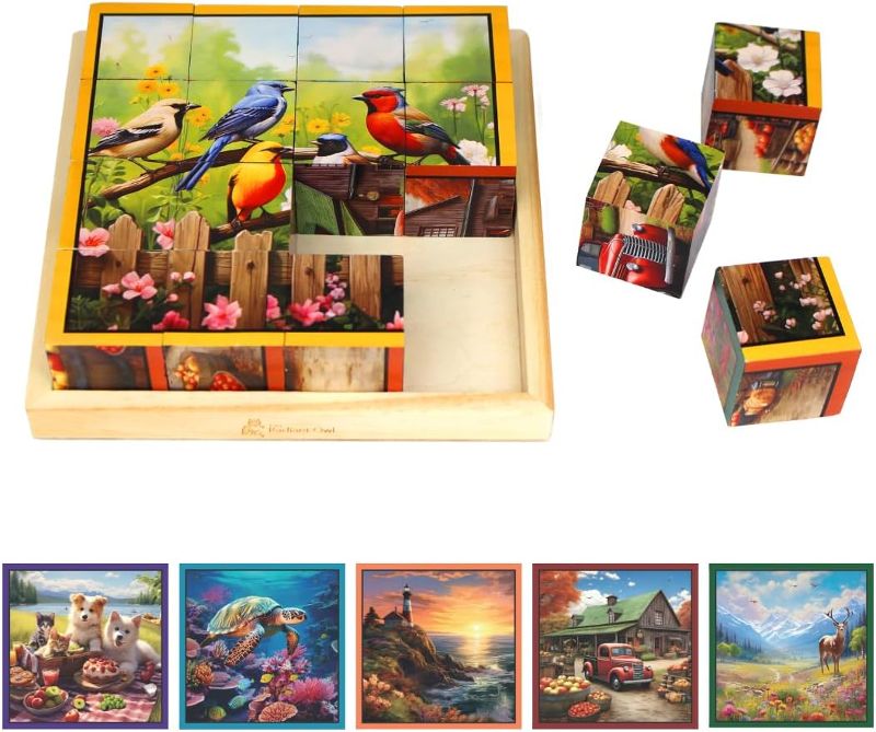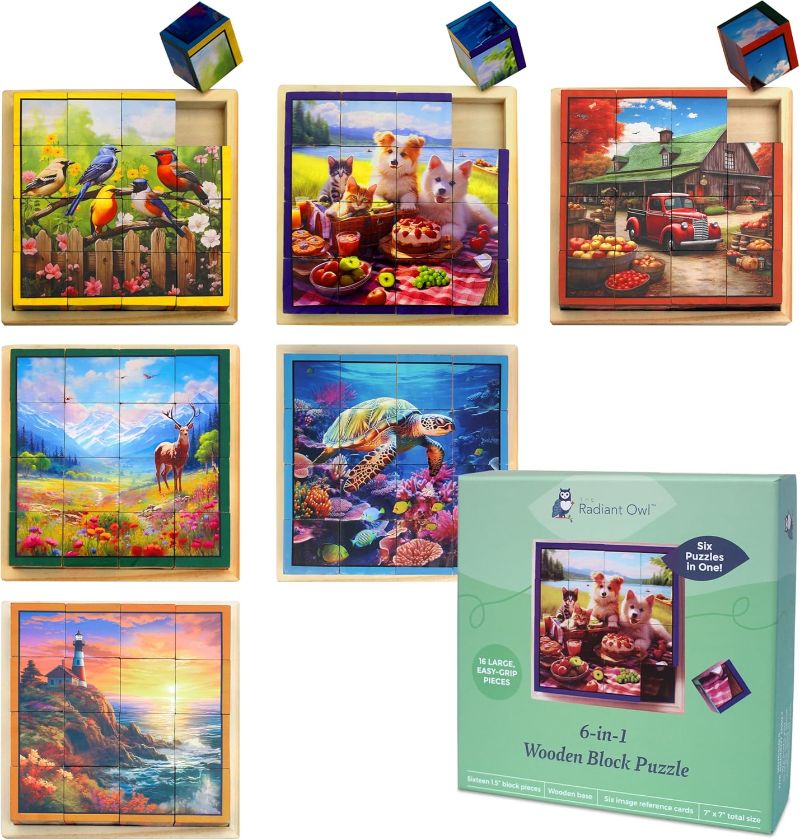 The Wooden Cube Puzzle is a versatile and educational tool designed to help the participant develop their fine motor skills, hand-eye coordination, and problem-solving abilities. The puzzle includes 9 solid wooden cubes that can be rotated and arranged in various ways to form different pictures or patterns. The goal is to match the picture clues on the wooden blocks to complete the six different puzzles included in the set.