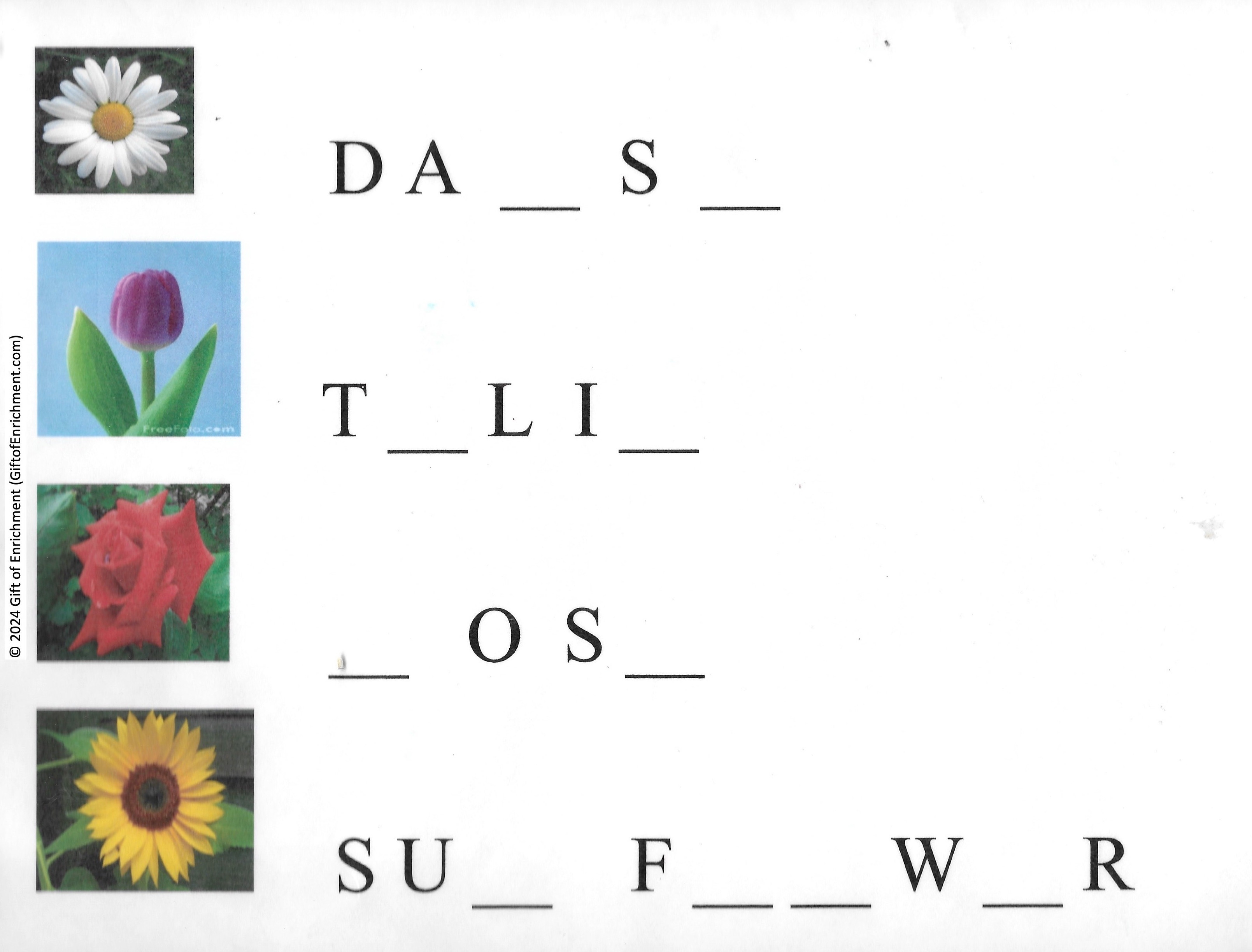 The goal of the game is straightforward: find the letters missing from a word that’s paired with an image. By connecting pictures with words, participants engage both language and memory, making the activity accessible and rewarding.