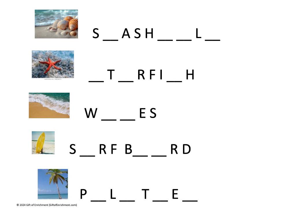 Missing Letters is a fun and educational game that helps cognitive skills. Each page has a list of words with one or more letters missing from each word and an image associated with the word. The dementia participant, along with a set of letters, can use them to fill in the blanks. For early-stage dementia (D1), more missing letters are provided for each word.
